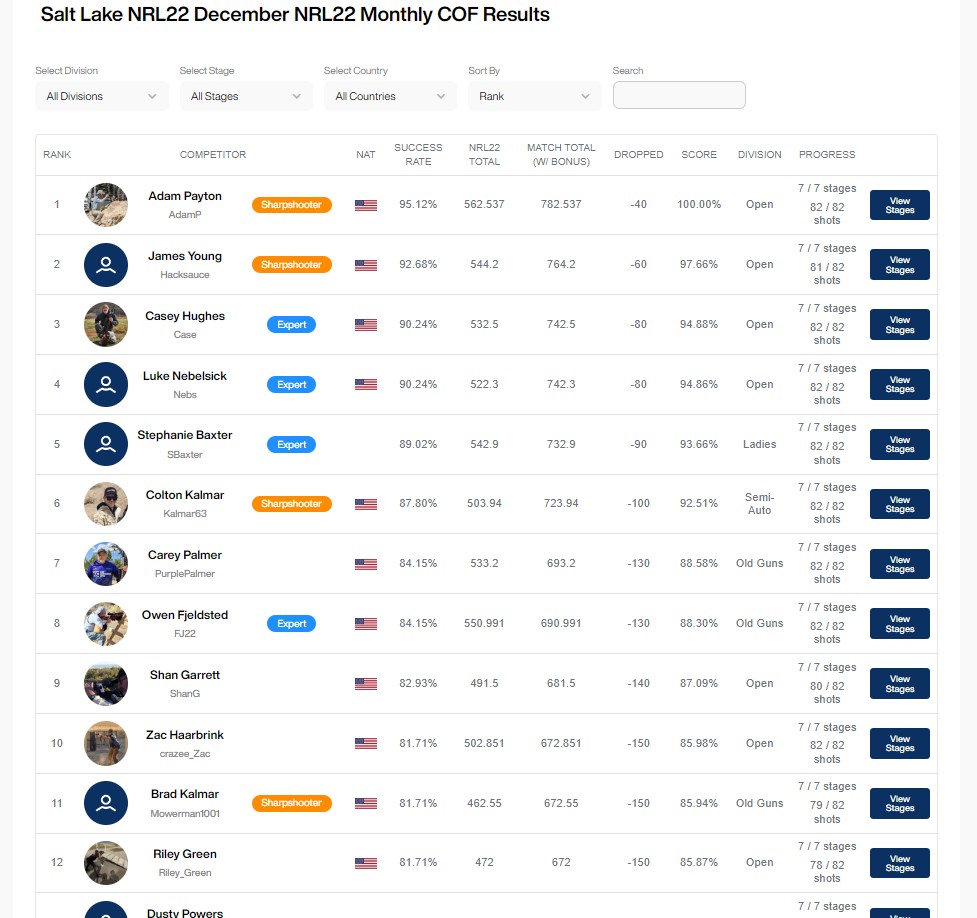 Adam Payton takes top overall and 1st in Open Division dropping only 4 shots the entire match, including the bonus stages.  Adam racks up 562.5 points for the win.  James Young was right behind with 544.2 points for that second-place ribbon.  The fight for that 3rd place bronze came between Casey Hughes and Luke Nebelsick who tied, but Casey was .2 points faster on the timed stage to take the win.  Casey scored 745.5 points to Luke’s 742.3.