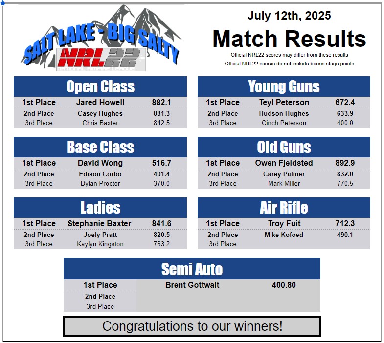 The match ran amazingly well, and I want to thank all our shooters who stepped up to help our new members have such a great experience. A special thanks goes out to Carey Palmer who spent a few weeks at the range cleaning up the bays and putting down the new gravel and smoothing out the parking lot! The range looked amazing, and it made for an enjoyable match for everyone. Thanks always to Owen, Carey, and all those that helped set up and take down the targets before and after the match. Your help is always appreciated and makes it so much easier to run these matches.