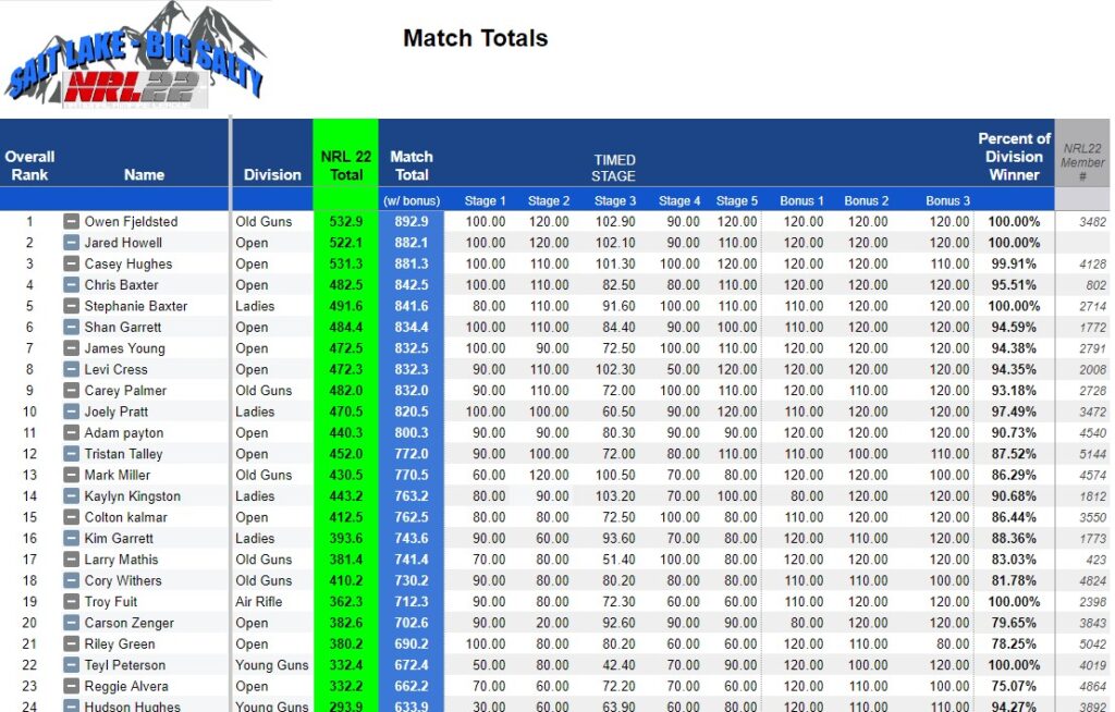 Dropping only 1 shot for the entire 8 stages is Owen Feldsted. Owen proudly takes first place overall and 1st place gold in the Old Guns division earning 892.9 points! Amazing shooting Owen. Second place silver goes to Carey Palmer with a 9th place finish overall and 832.0 points. Third place bronze gets picked up by Mark Miller who placed 13th overall with 770.5. Great shooting OG’s!