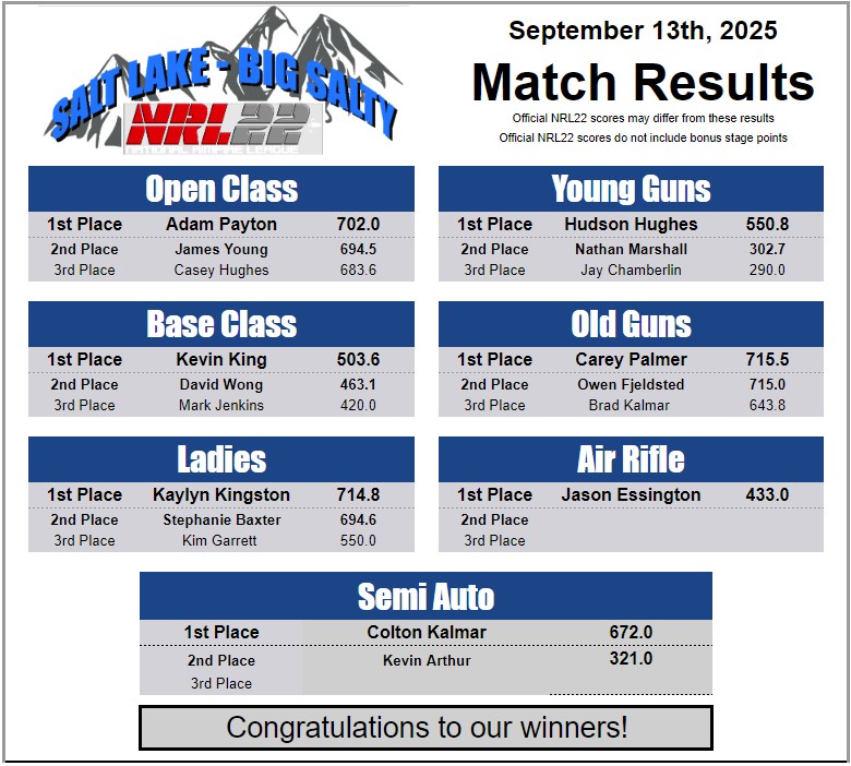September is the down slide to fall and predecessor to winter. Things start cooling off and the weather begins to change up a bit. Days get shorter but the fall leaves and cooler evenings are a blessing, especially here in the beautiful state of Utah. The cool weather was amazing Saturday, but that was all that cooled off! We had 46 shooters, 9 of them 1st time shooters! The divisions were 16 Open, 6 OG, 13 Base, 4 Ladies, 3 Young Guns, 1 Air Rifle and 2 Semi-Auto. With this amazing field, it came down to just seconds as our top 6 shooters were only separated by 2 impacts and our top 3 were separated by only 7 seconds!